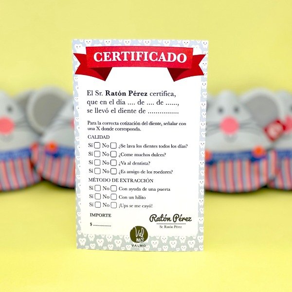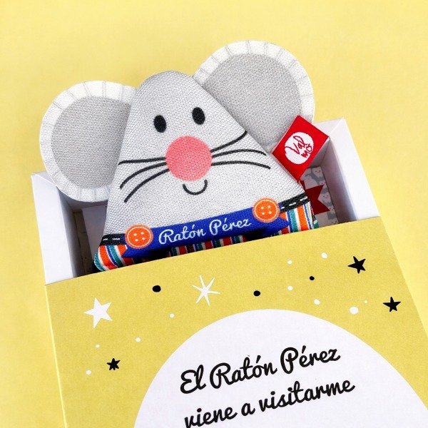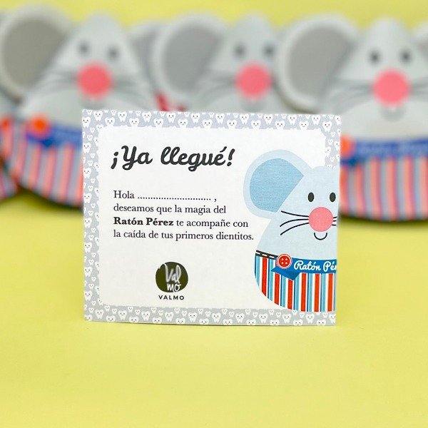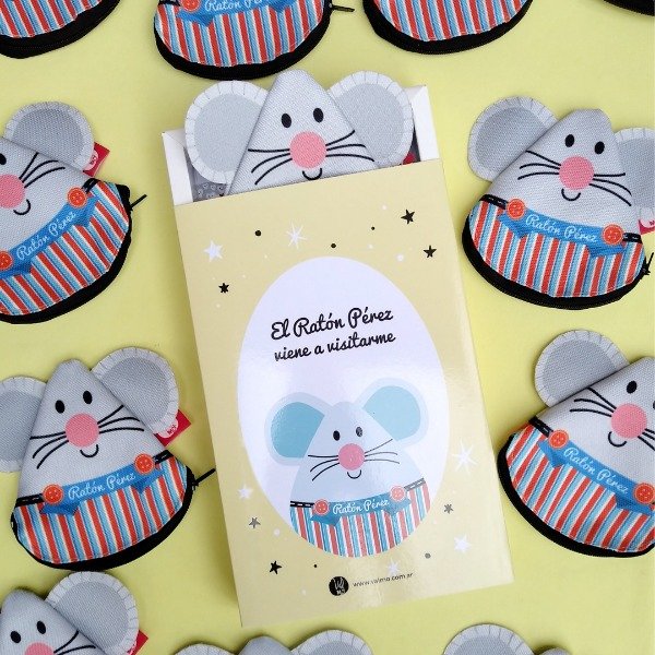ESTUCHE GUARDADIENTE + CERTIFICADO PERSONALIZABLE + COLGANTE PARA PUERTA PERSONALIZABLE + TARJETA YA LLEGUÉ PERSONALIZABLE + STICKER DEL RATÓN + CAJA DESLIZABLE TIPO FOSFORERA ILUSTRADA PARA REGALO + BOLSA ILUSTRADA DE TELA CON MANIJAS. IMPERMEABLE Y REUTILIZABLE. LISTO PARA REGALAR.